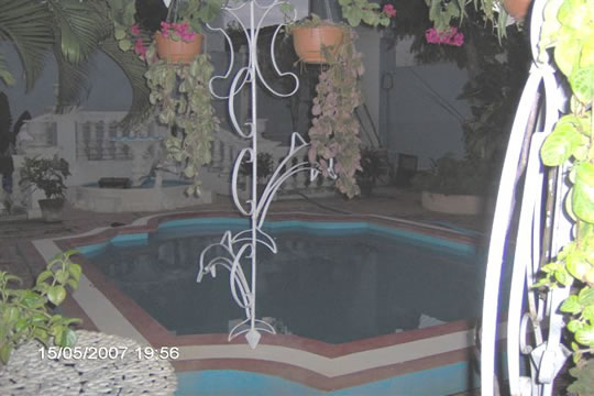 Tiene patio con piscina para uso de los turistas. Aves tropicales en jaulas, etc.